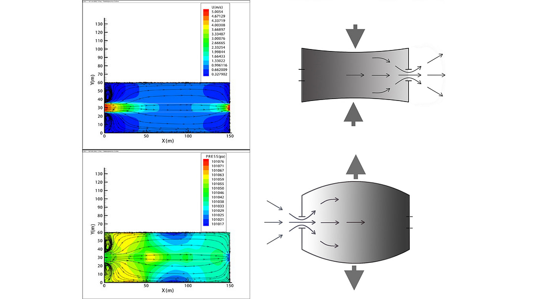 Le verifiche tecniche di questo sistema sono state studiate insieme all’ingegnere aerospaziale Giuliano Ranuzzi. Abbiamo studiato al livello preliminare l’interazione dei flussi aerodinamici, calcolando i campi di moto, i campi di pressione, e gli sforzi sulla struttura.