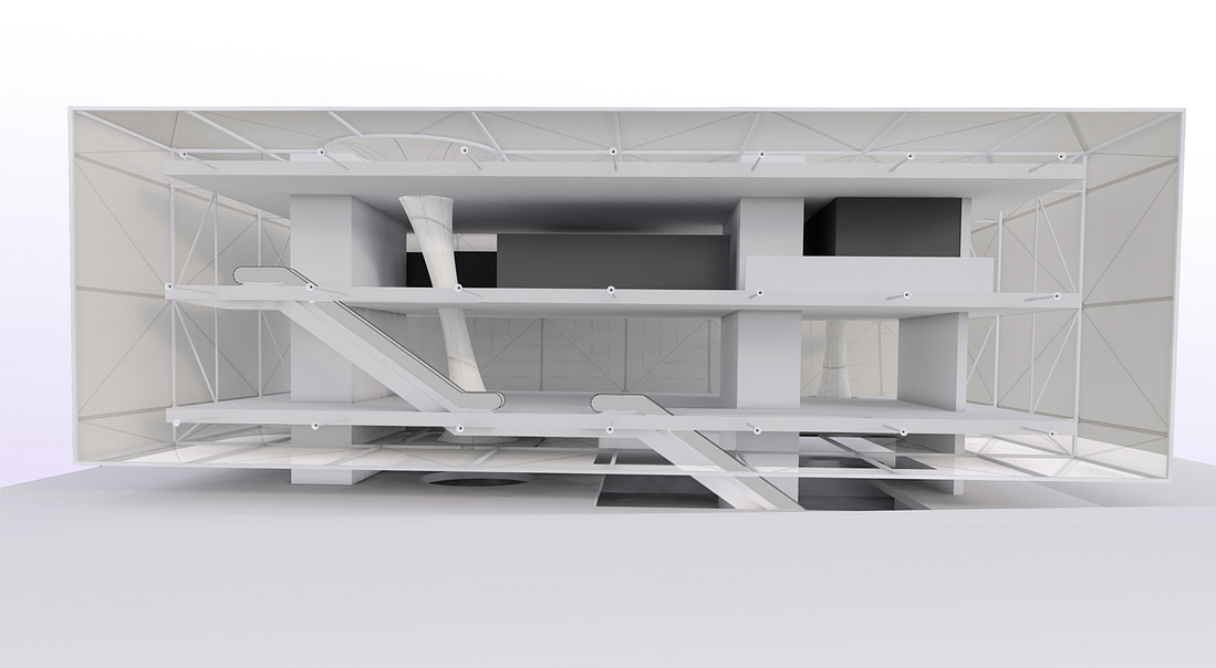 La membrana che avvolge completamente l’edificio sarà sostenuta dai pistoni e da una struttura metallica reticolare che si aggrappa al resto dell’edificio, costruito con solai di grande luce che poggiano su piloni in cemento armato che contengono i collegamenti verticali come ascensori e scale di emergenza, gli impianti ed i servizi.