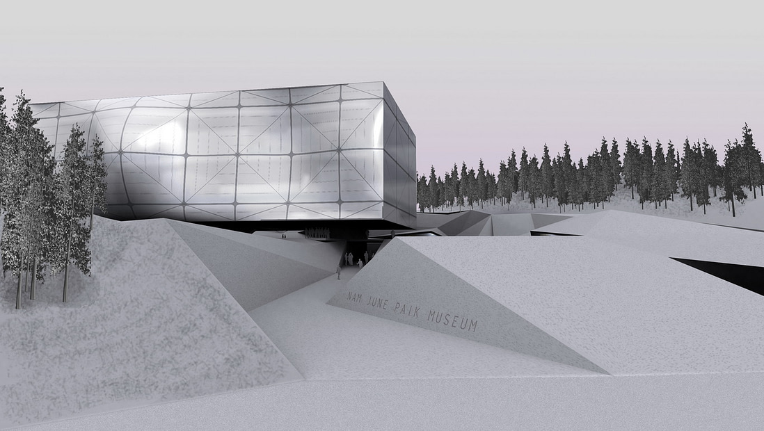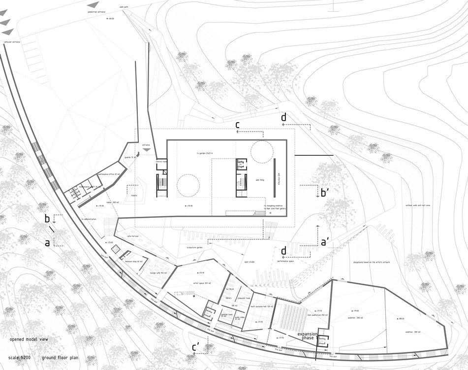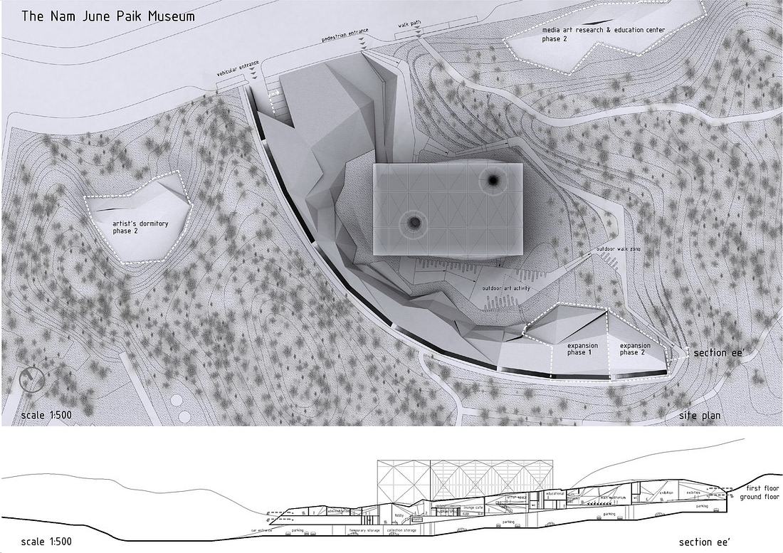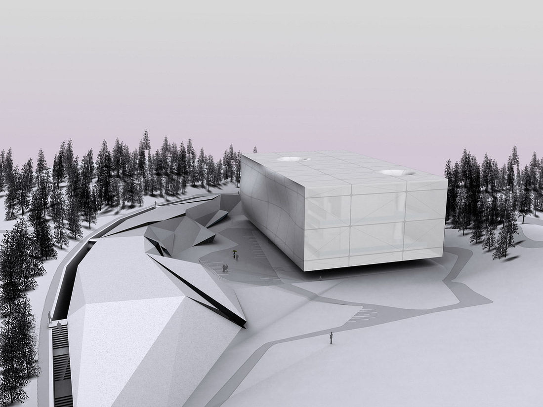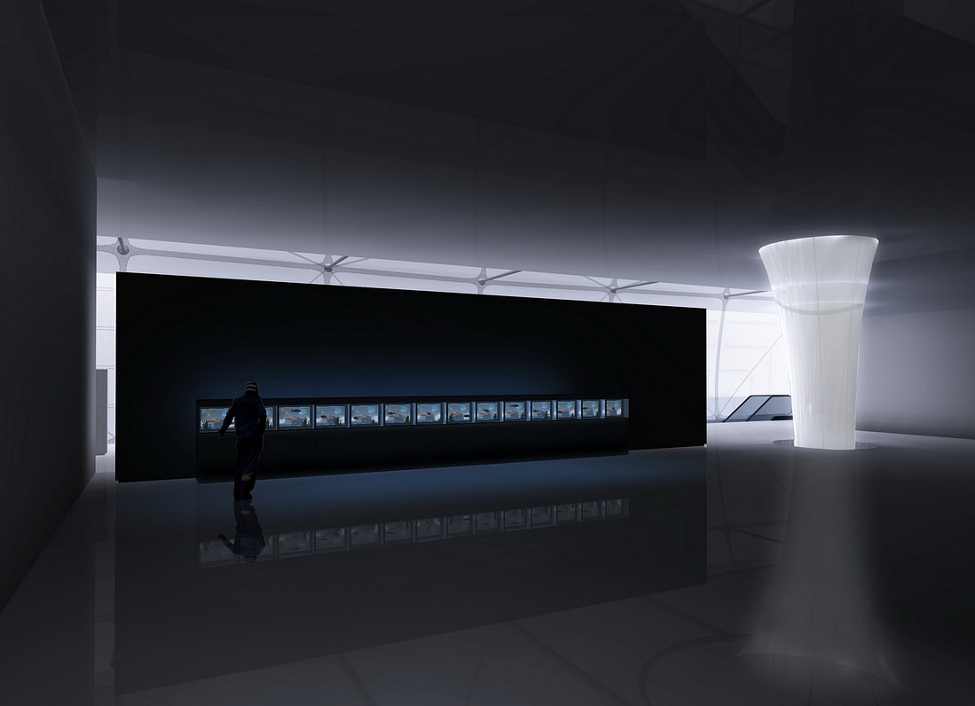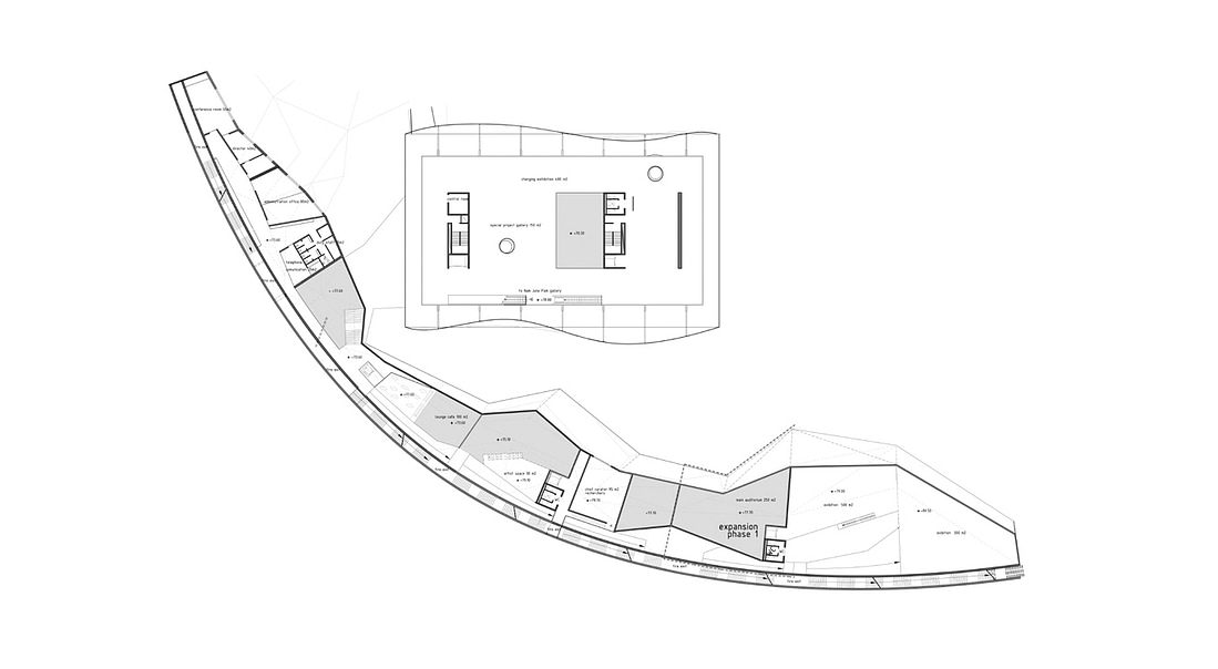 -La prima, nodo focale del progetto, è un monolito, atterrato sul sito come un corpo alieno al contesto, e proprio grazie a questo distacco enfatizzato di proposito, riesce a rispettare il luogo non invadendolo; ma “galleggiandoci” sopra come un elemento provvisorio pronto a riprendere il proprio volo da un momento all’altro. Questo edificio ospita le principali sale espositive.