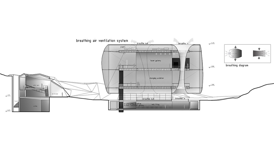 The bio-climatic control of the building functions with the cyclical swelling of the membrane which like a lung, in moments of maximum expansion, opens valves in one of the two clefts on the membrane, lets the air enter, and in the moment of lesser volume, lets the air out of the second cleft.