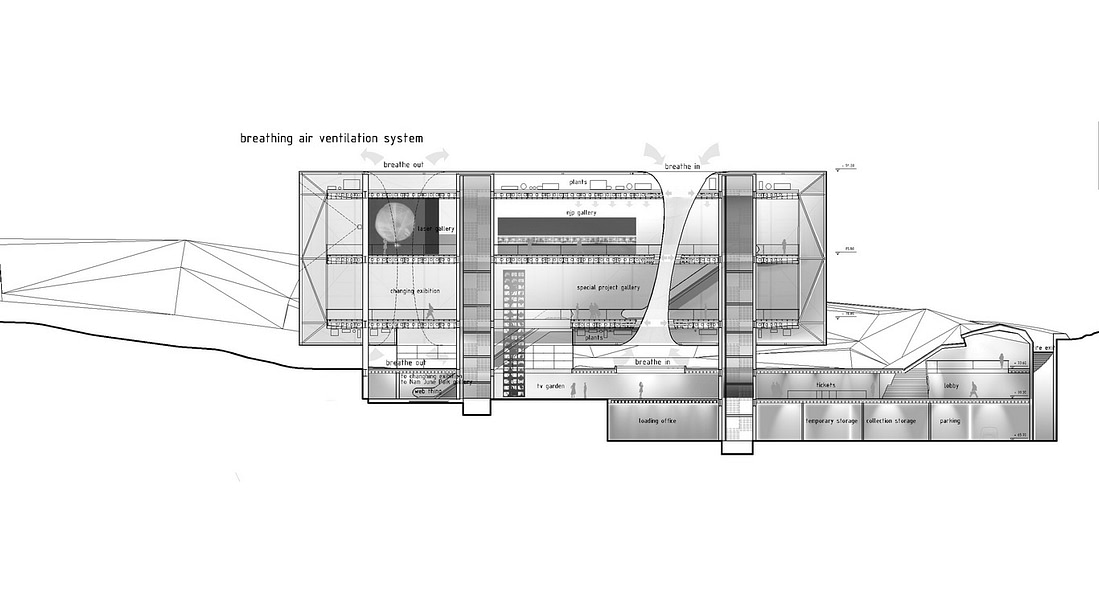 - The second is a low curved tongue which blends into the morphology of the existing valley following the contour lines. The character of this building, which is partly underground, is not completely mimetic; in fact it emerges from the ground as might emerge a rock from a wind eroded landscape.