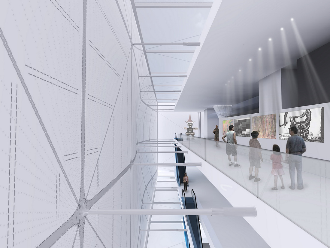 博物馆对于外部环境的灵敏反应如同变色龙一般。实际上它就彷如一个生命体,通过“感应器”,可观、可闻、可尝、可嗅、可触,同样由于这个“感应器”,它可以对外界的环境变化产生不同的反应,它表面的形状和颜色变幻不定,以光、以声、以语汇、以运动向外部世界传递种种资讯。
